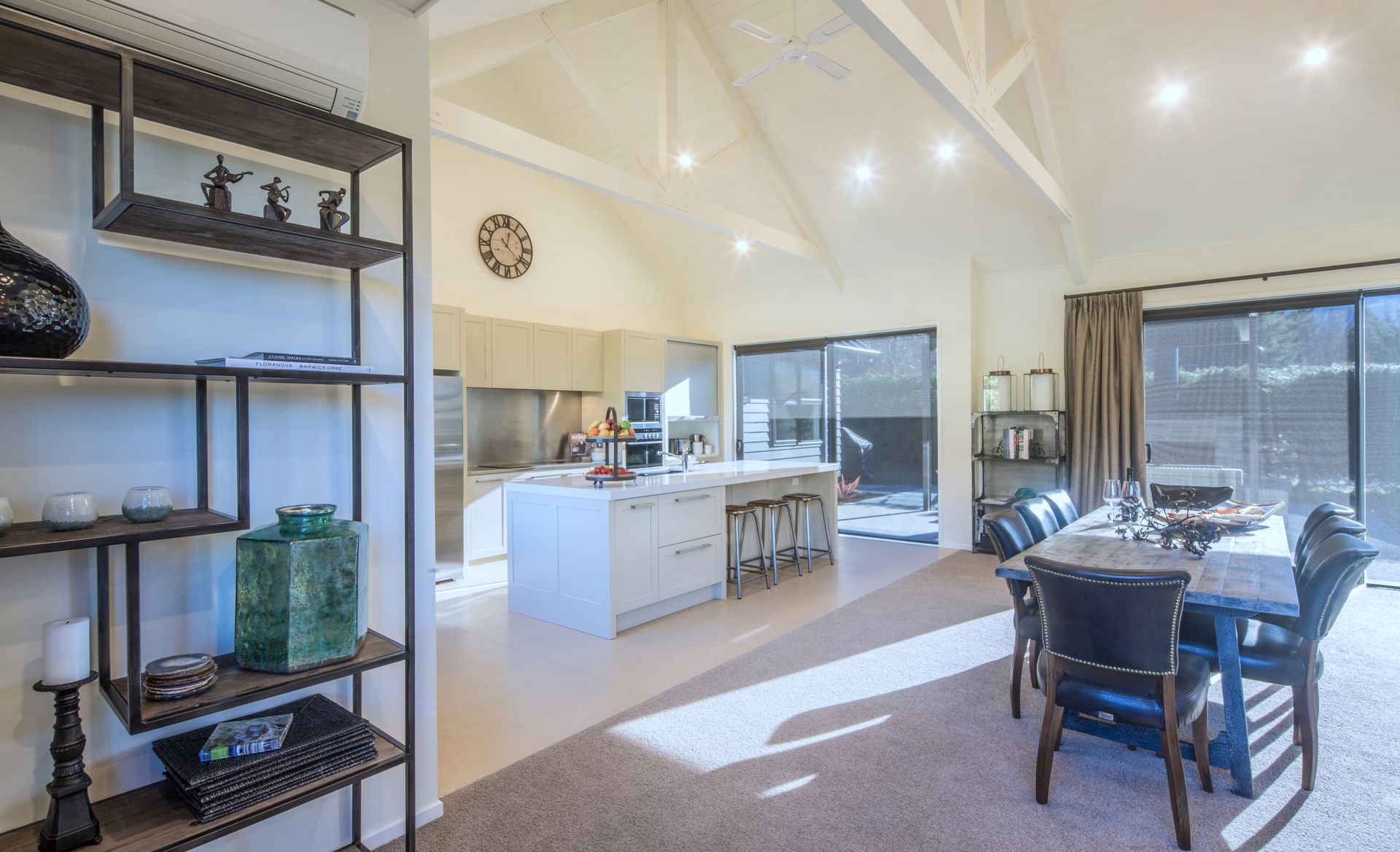 This large spacious home has four king bedrooms, three bathrooms and two large living areas. Perfect for a large family coming together for a memorable holiday or ideal for two families wanting to have a break away together. The interior has been stylishly equipped and it’s tall windows and high ceilings create a very airy and spacious feel. There is room for everyone with its two living areas and there is also a study with a rollaway bed should space be required for an extra guest.